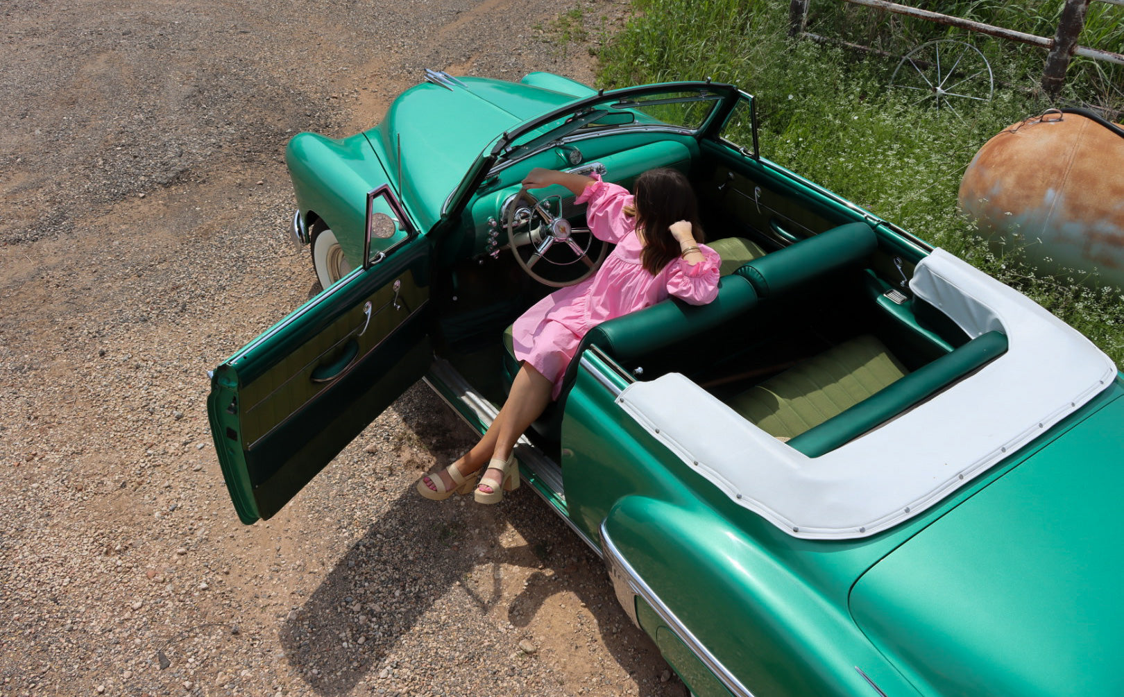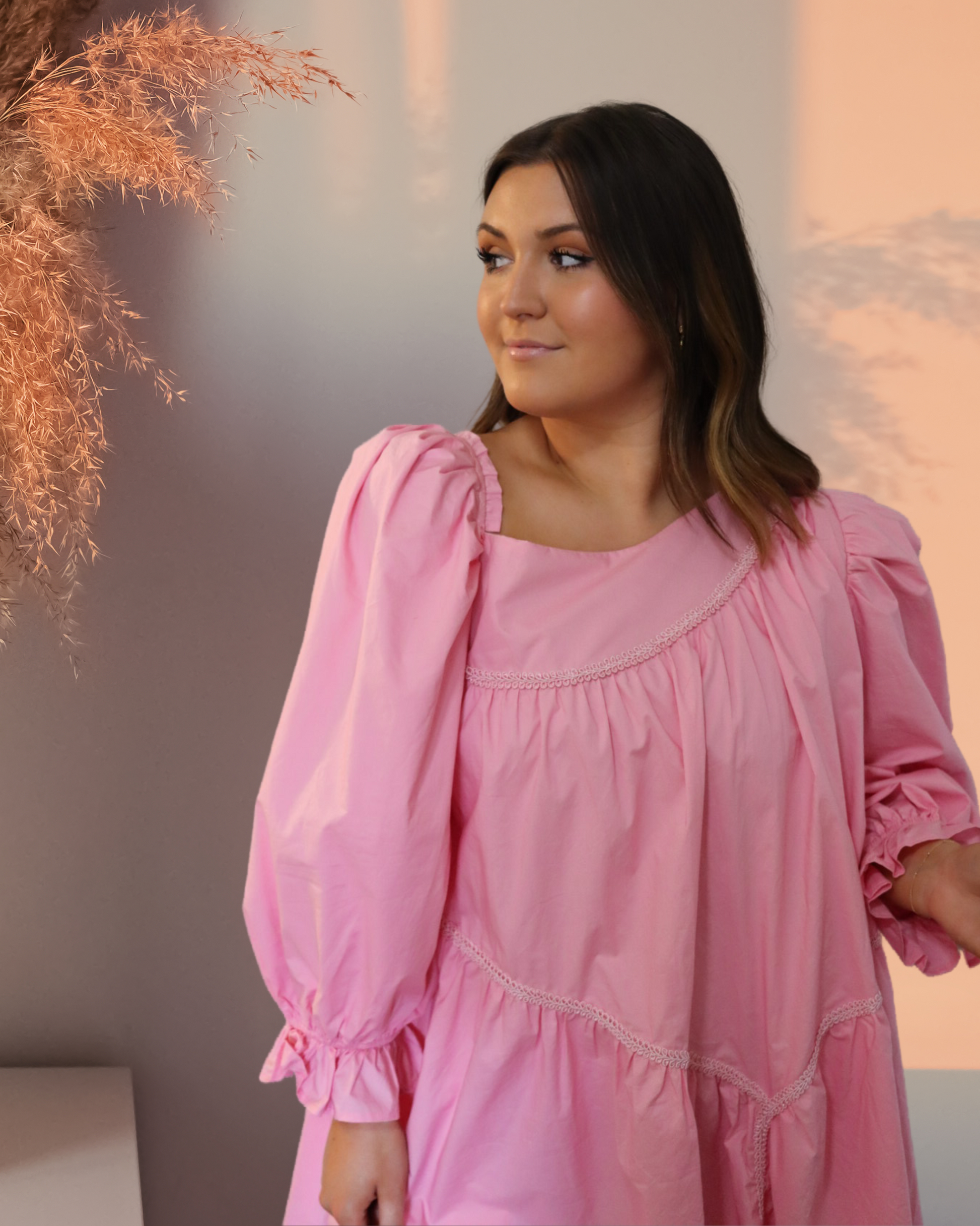 cotton poplin aysmetrical shoulder puff braided seam flowy mini dress
