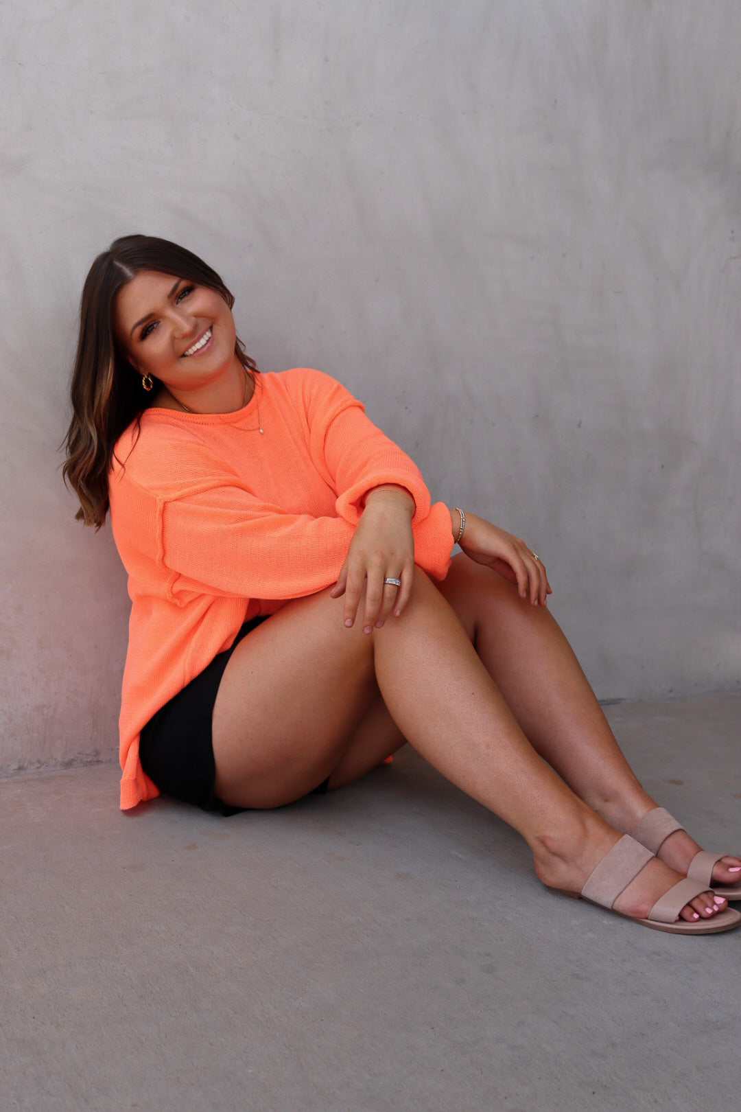 this bright orange sweater is lightweight and has a relaxed and loose fit that is perfect to toss over any tee or style on its own with a great pair of denim.