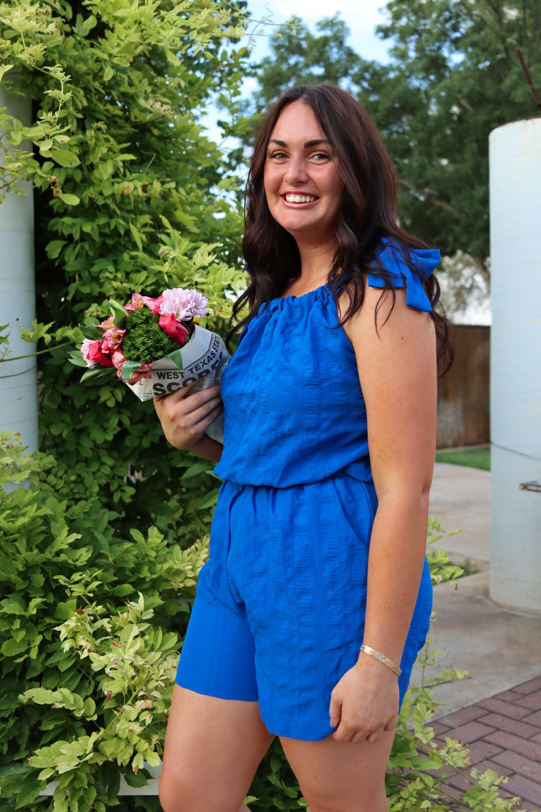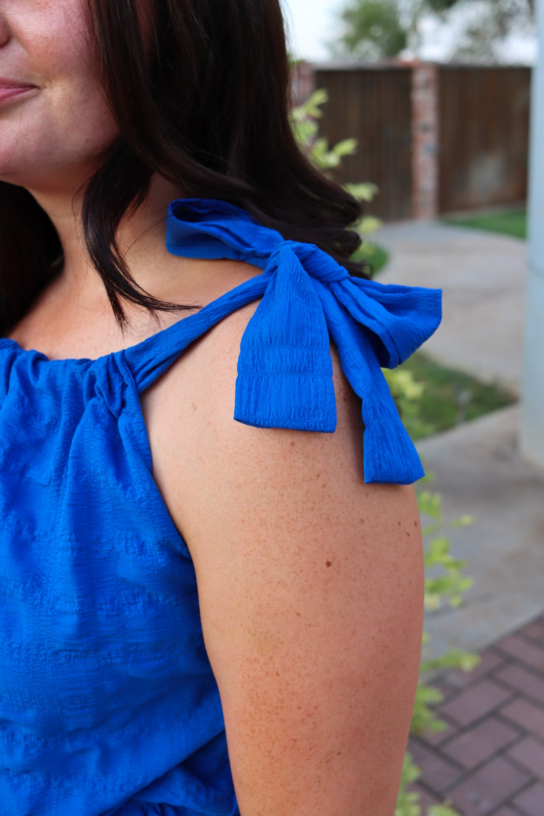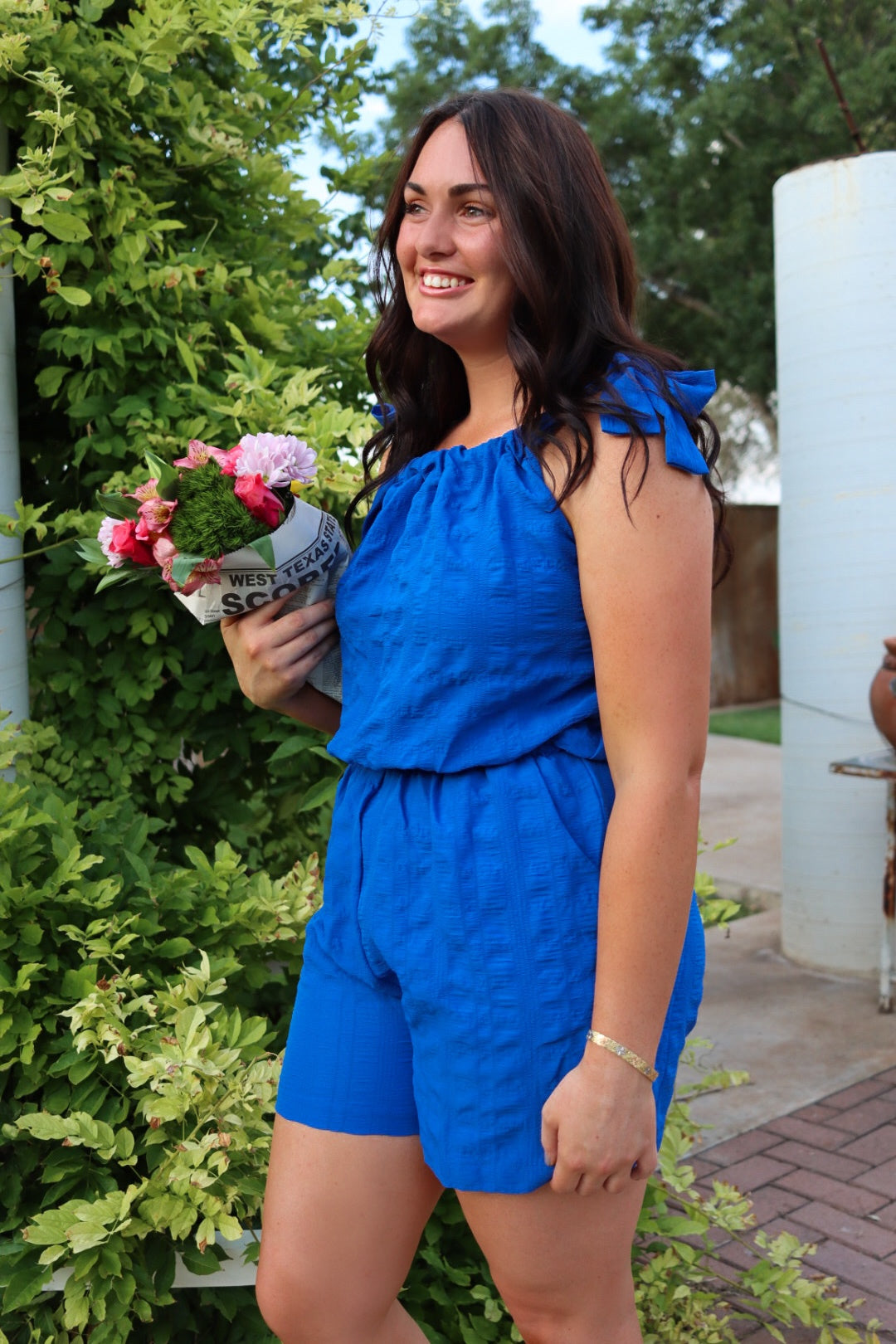 this bow shoulder romper with sleeveless self-tie straps, elastic waist and side pockets