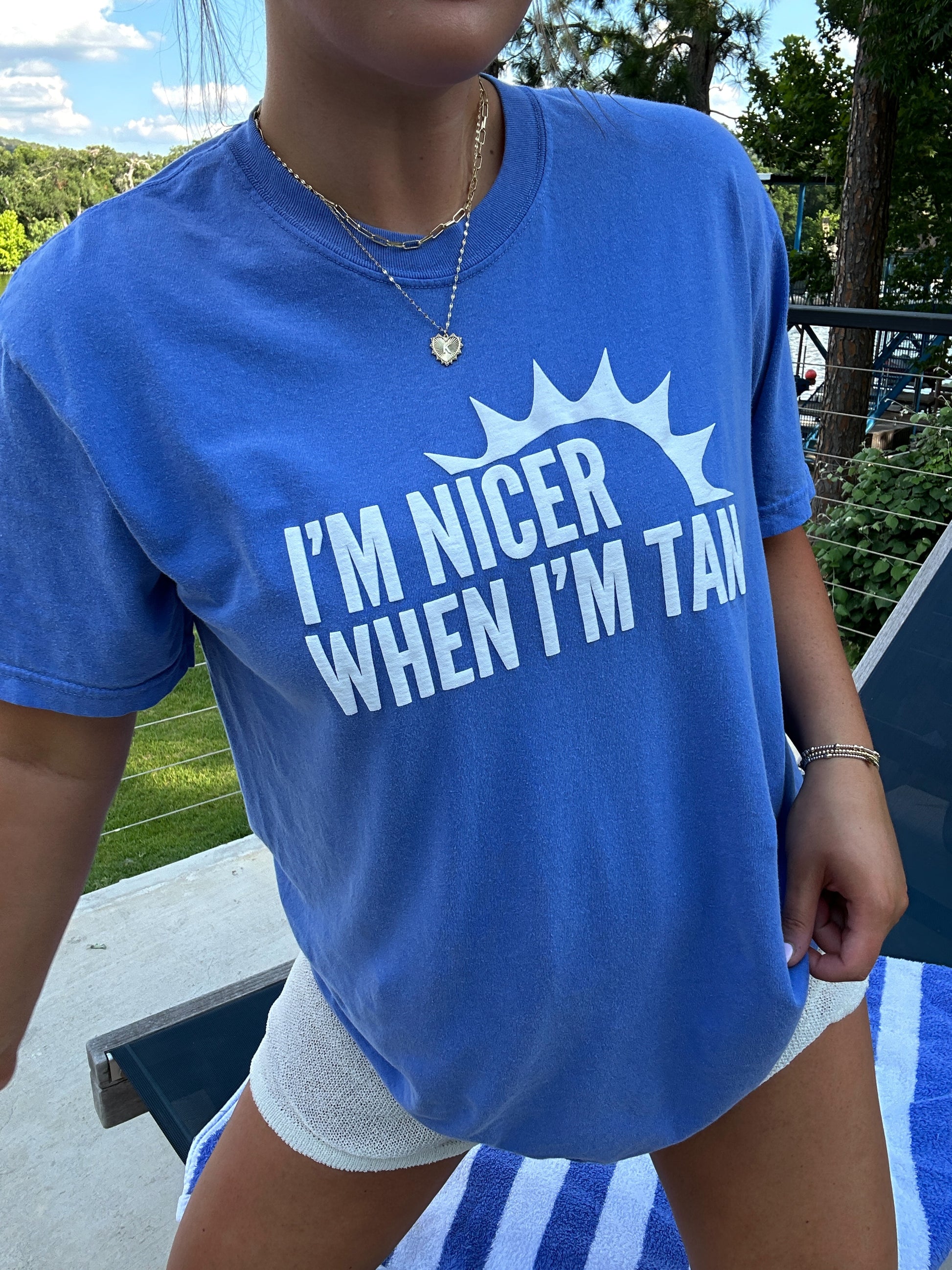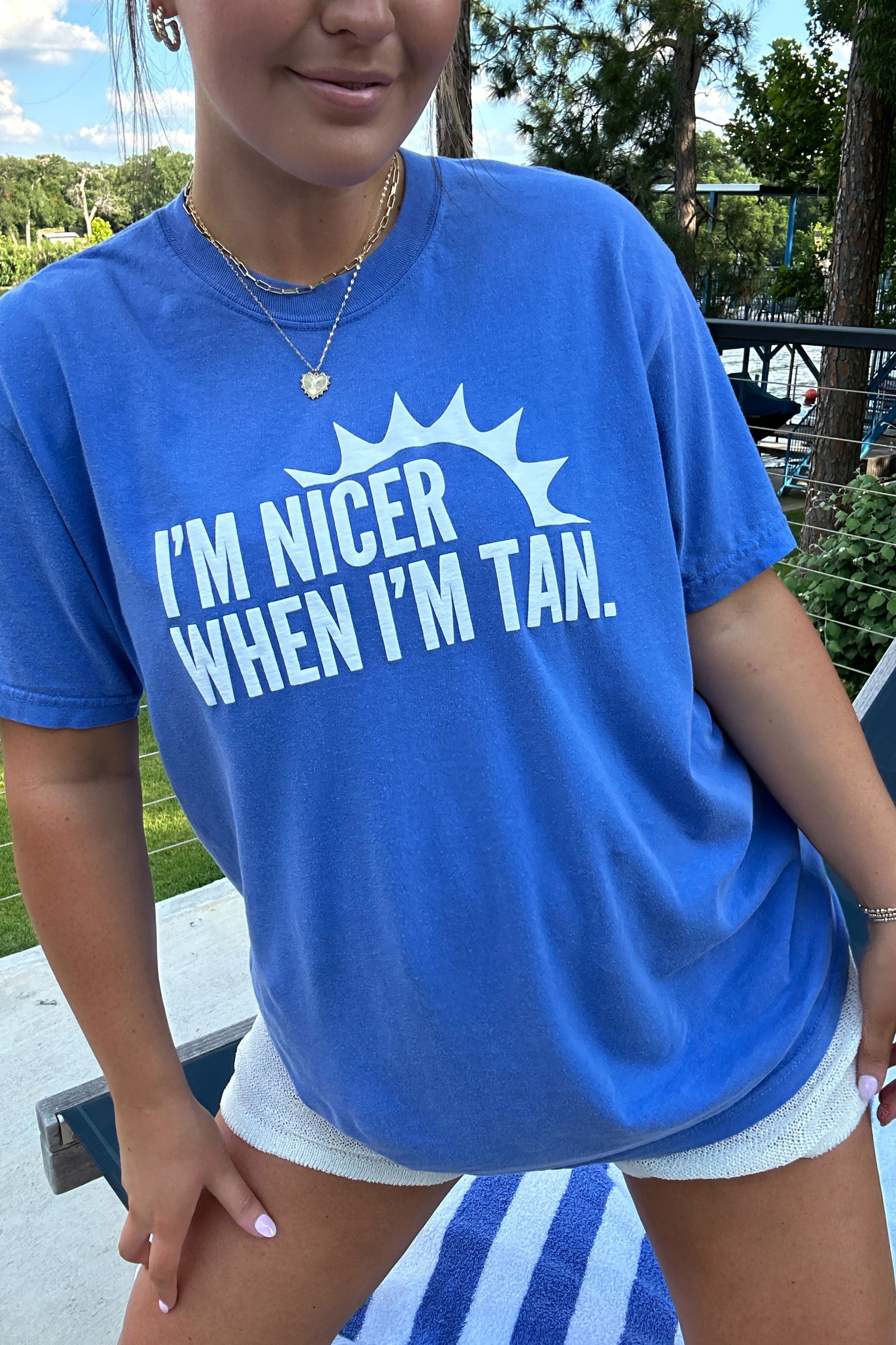 i mean, could you think of a better phrase? this blue tee with white "i'm nicer when i'm tan." is in puff print and the tee is everyone's favorite... comfort colors!