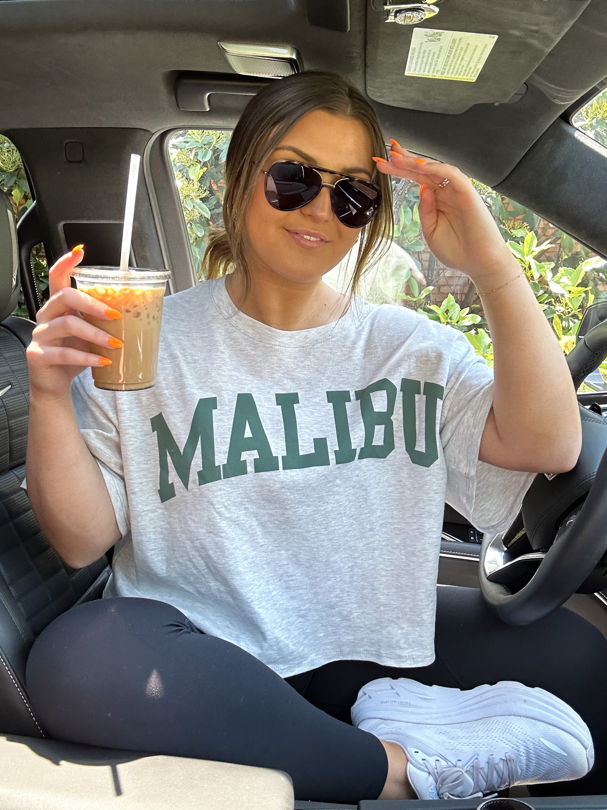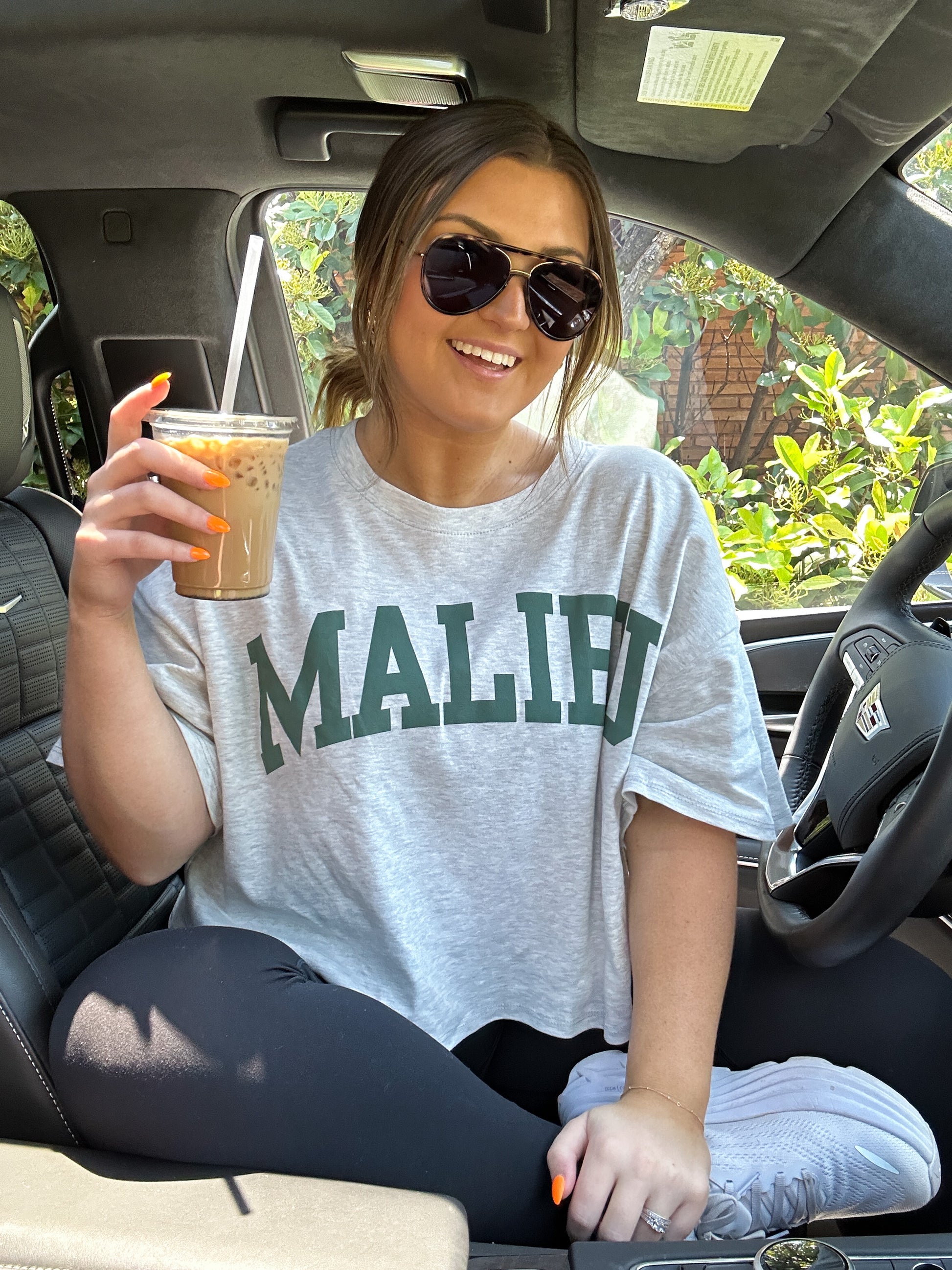 heather grey malibu graphic tee features a crew neckline, short sleeves with a loose fit.