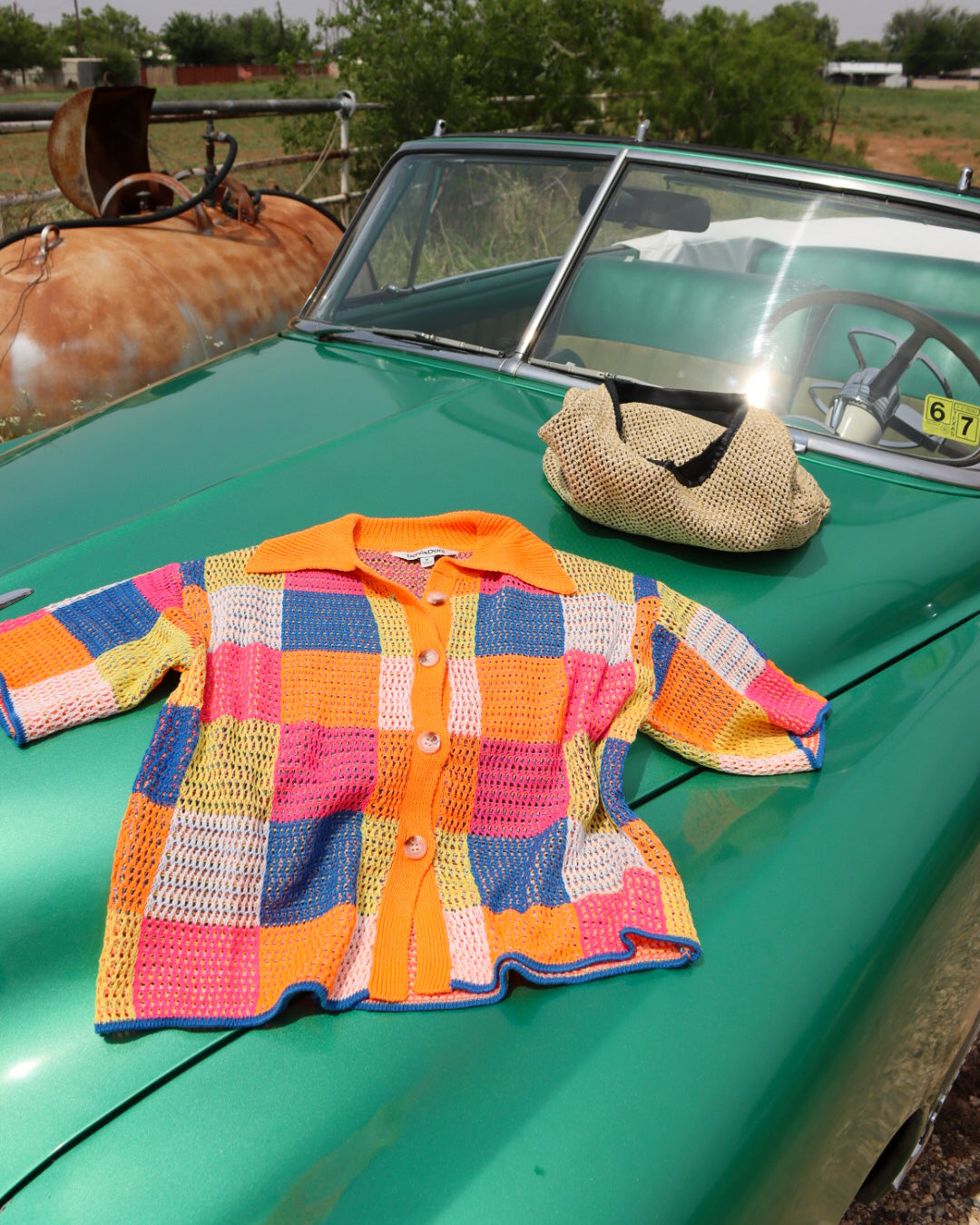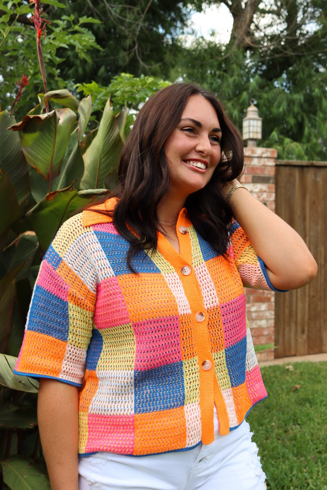 multi color blocked checker textured knit button front sweater top