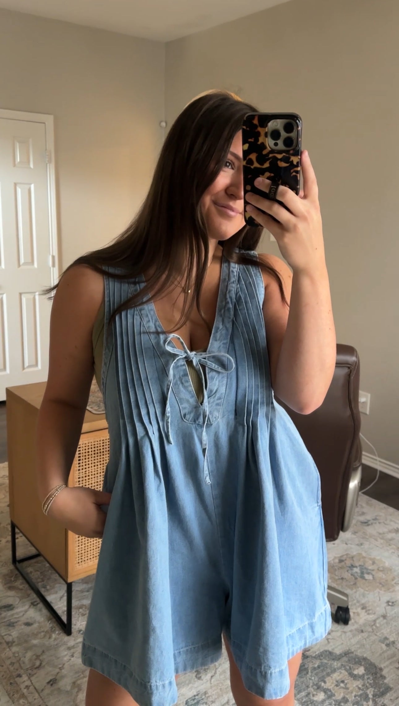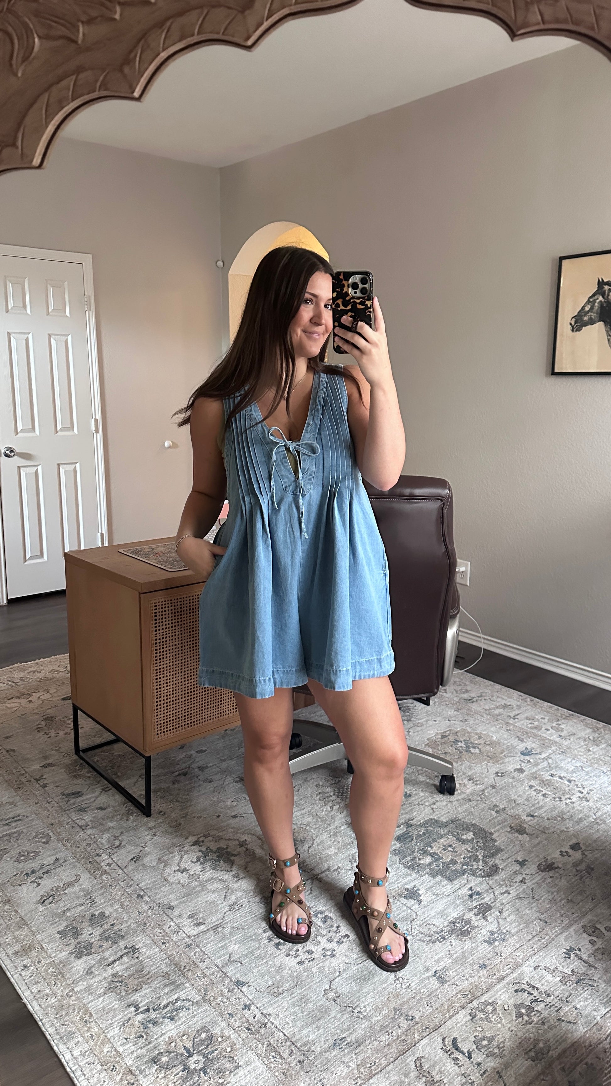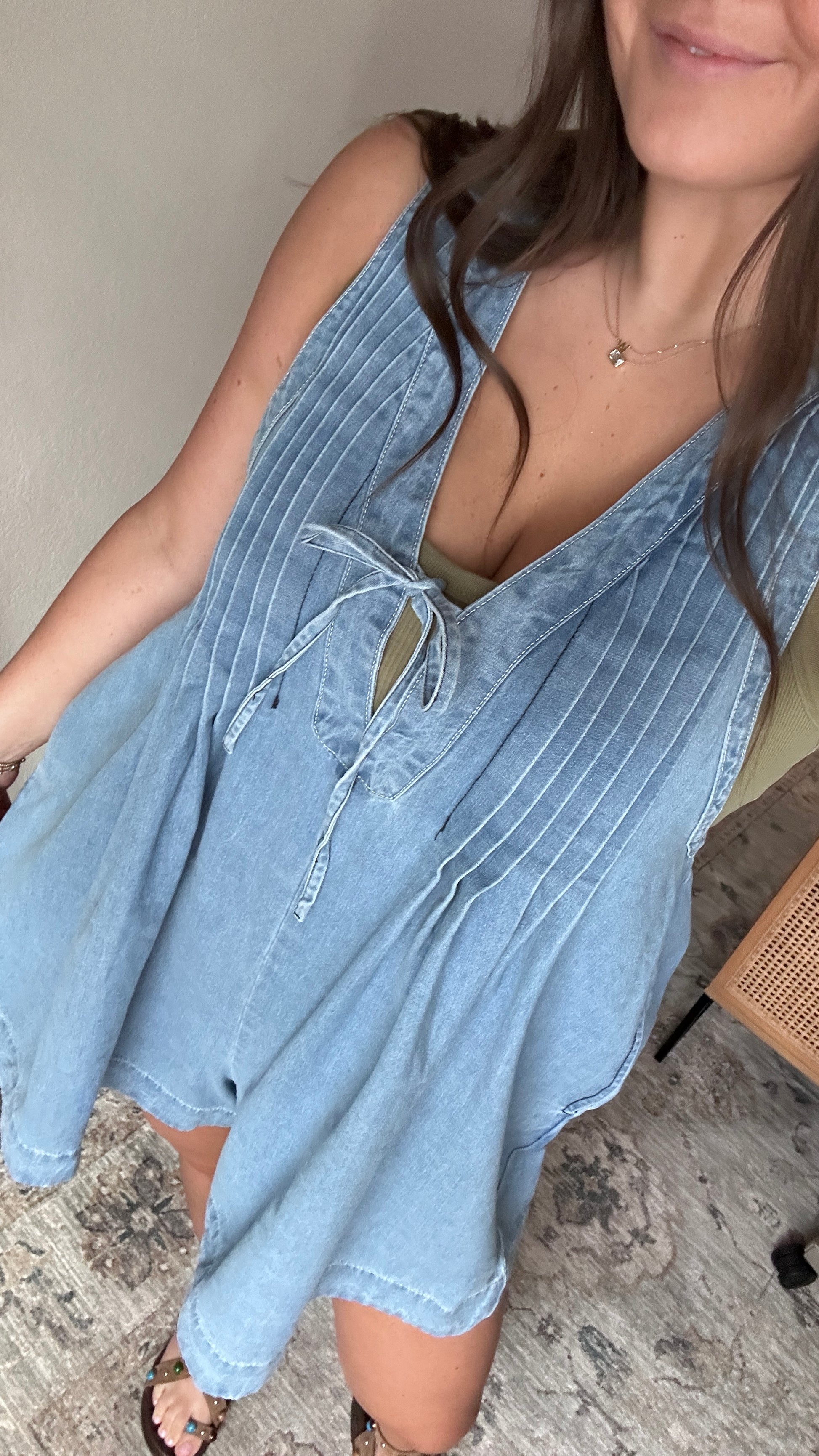 this denim romper features a v-neck with string tie, pleated details in the back, side pockets & is 100% cotton.