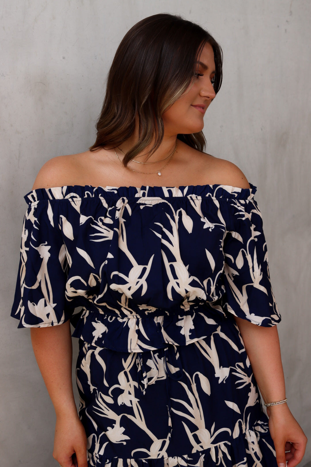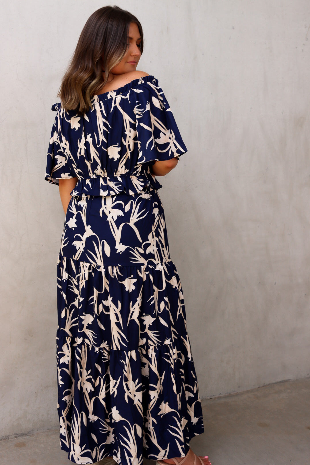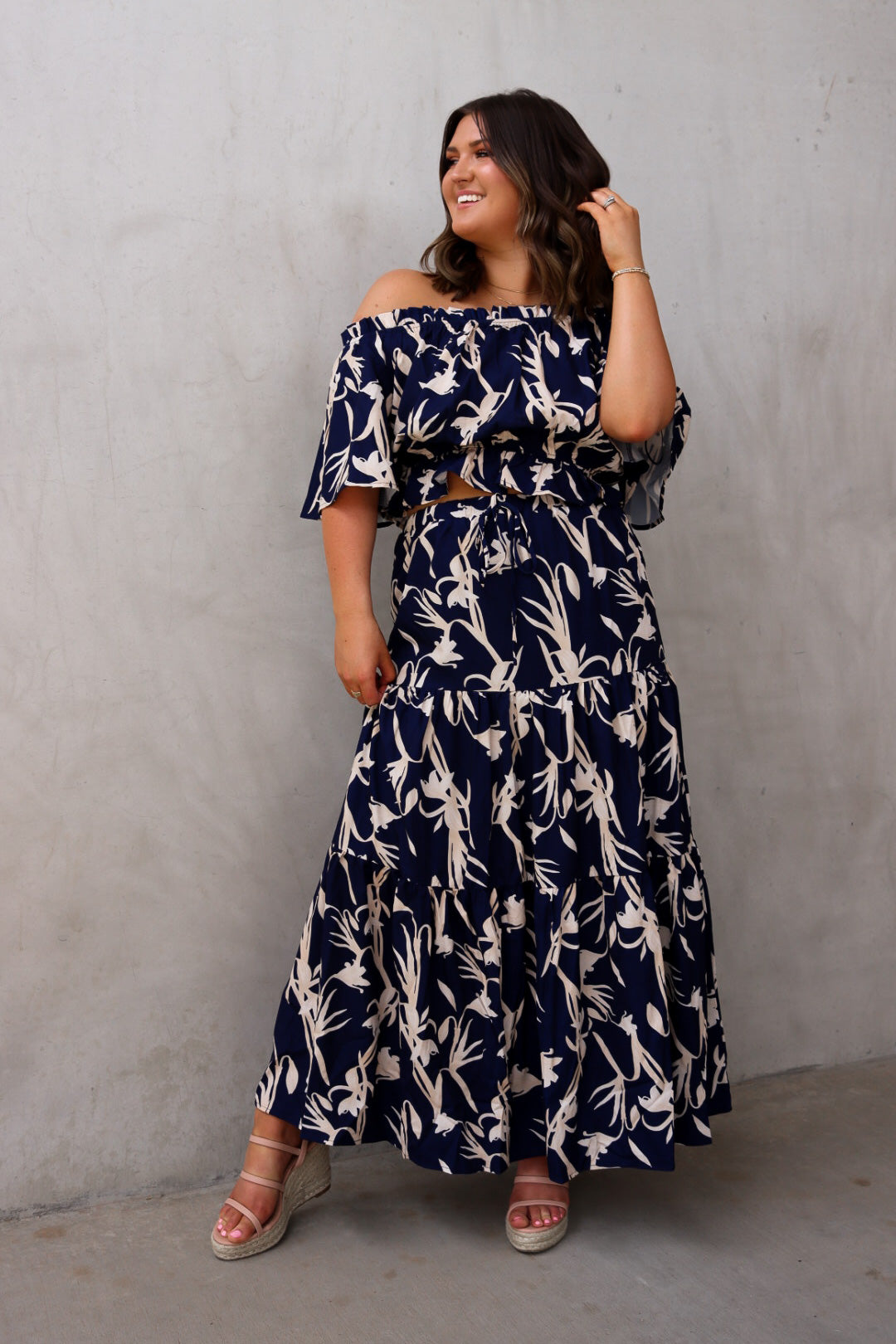 this set features an off the shoulder half sleeve top with a tiered maxi skirt that are perfect paired together or separately