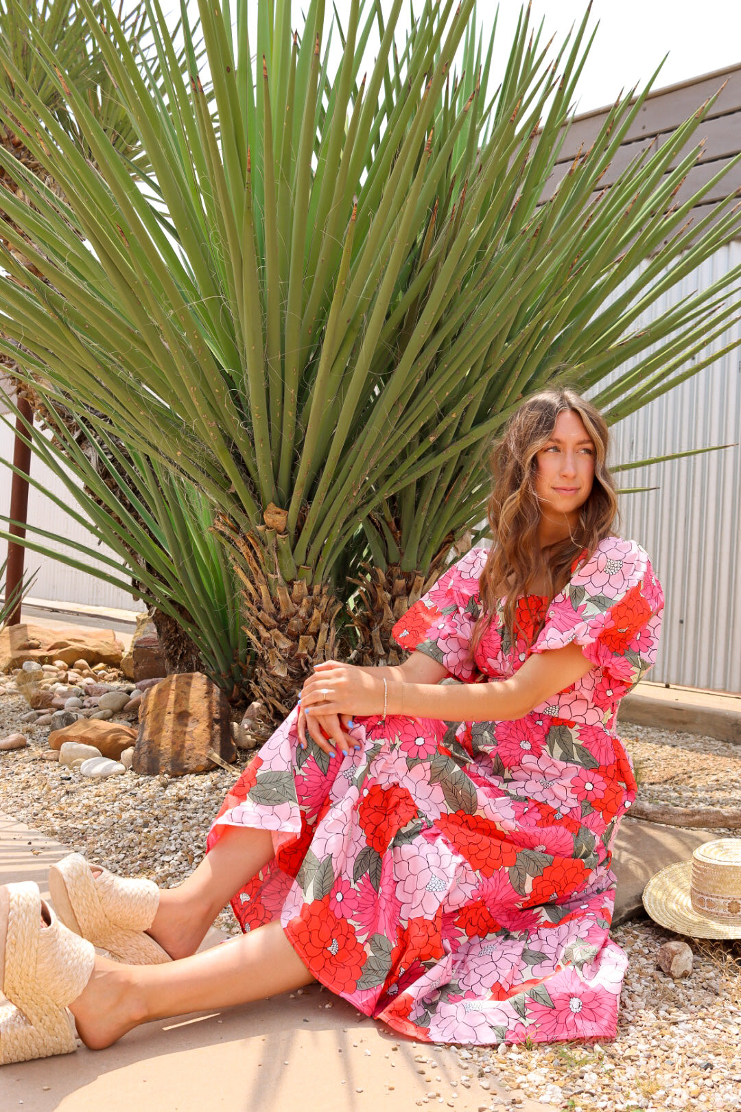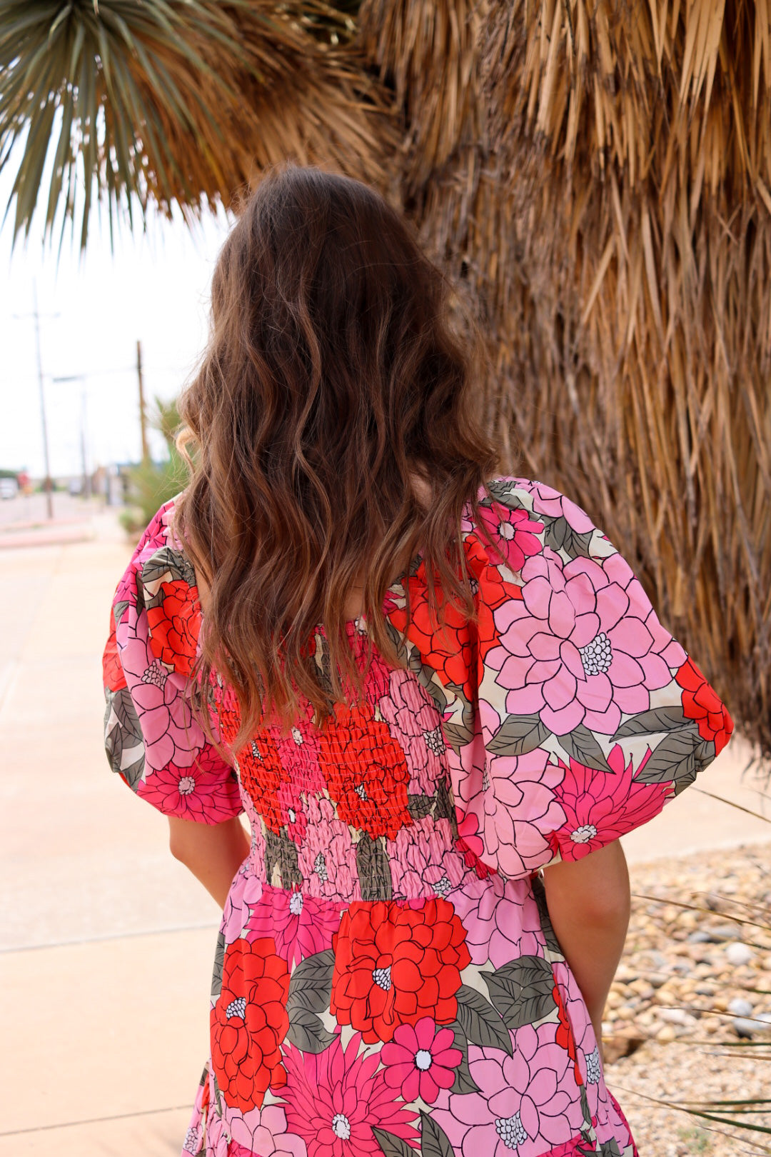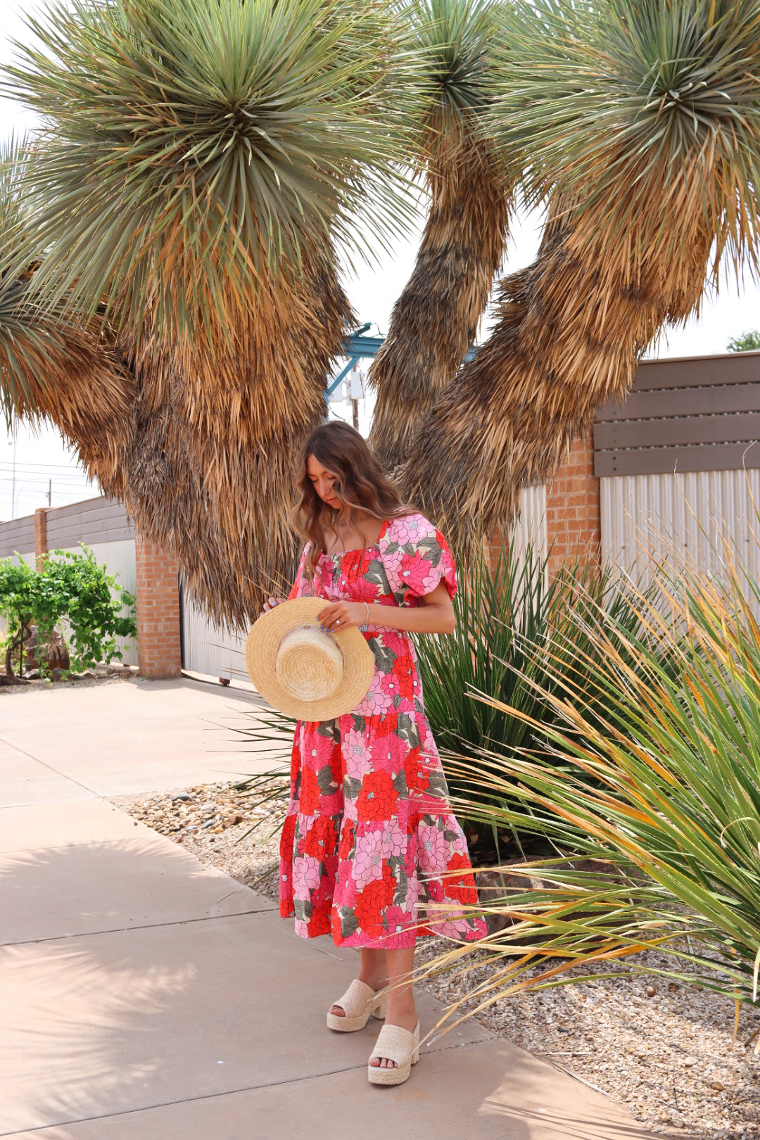 this floral puff sleeve tiered midi dress features a square neck with elastic, smocking on back and puff sleeve with elastic cuffs! there are also hidden side seam pockets!